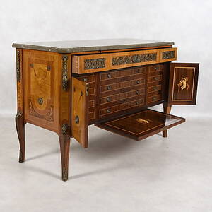 BYRÅ med stenskiva, 1900-talets mitt, sannolikt Carl Löfving & Söner, gustaviansk stil, sk. Hauptkopia, fanerat i olika träslag, dekor i intarsia, mässingsbeslag, höjd ca 82, Läs mer...