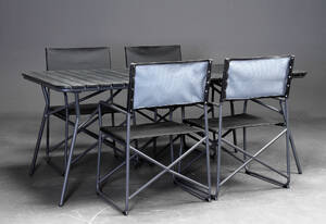 Aluminium och textil. Bordet 81 x 80, höjd 72 cm. Pallen 51 x 38, höjd 43 cm. 2 karmstolar, sitthöjd 46, bredd 57, höjd 87 Läs mer...