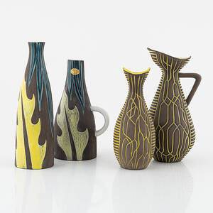 Mari Simmulson, kanna och vas, "Agave" samt Hjördis Oldfors, kanna och vas, "Lian", Upsala-Ekeby. Lergods, delvis glaserat med dekor i gult och blått. Stämplade UE Läs mer...