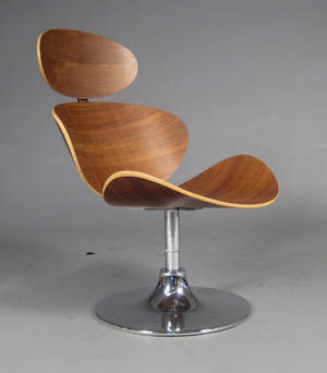Aros design. Wave hvilestol af formspændt valnøddetræ, drejligt stel og trompetfod af forkromet metal. Udstillingsmodel. Fremstår med enkelte små ridser på sæde Läs mer...