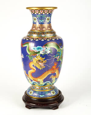 Chinesische Cloisonnévase, auf Holzsockel stehend, umlaufend Drachenszenerien, Gesamthöhe mit Sockel ca. 60 cm, allgemeine Gebrauchs- und Reibespuren, Kratzer, Sockel minimal bestoßen. Läs mer...