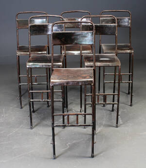 Barstole lavet af vintage caféstole af jern fra 1960erne, brugt i Indonesien og siden renoverede og forlænget med påsvejsede ekstra længder på ben til barstole højde. H. ca. 111 cm, sædehøjde ca. 70 cm. (6)