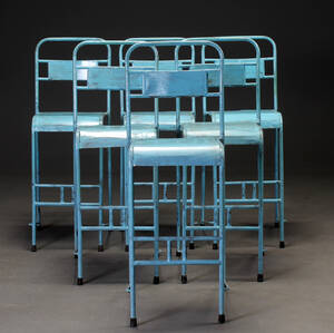 Barstole lavet af lyseblåmalede vintage caféstole af jern. Jernstole fra 1960erne, brugt i Indonesien og siden renoverede og forlænget med påsvejsede ekstra stykke på ben Läs mer...