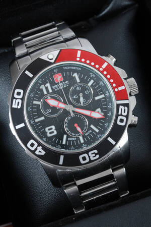 Swiss Military Hanowa. Herrearmbåndsur Chronograph. Swiss made. Urkasse Ø45 mm. og lænke af børstet stål. Sort/rød lynette med minut skala. Sort urskive med tachymeter skala, Läs mer...